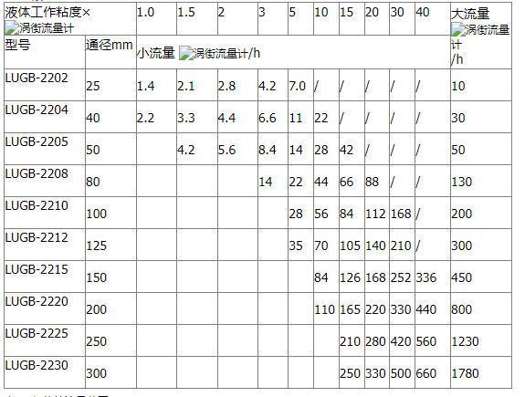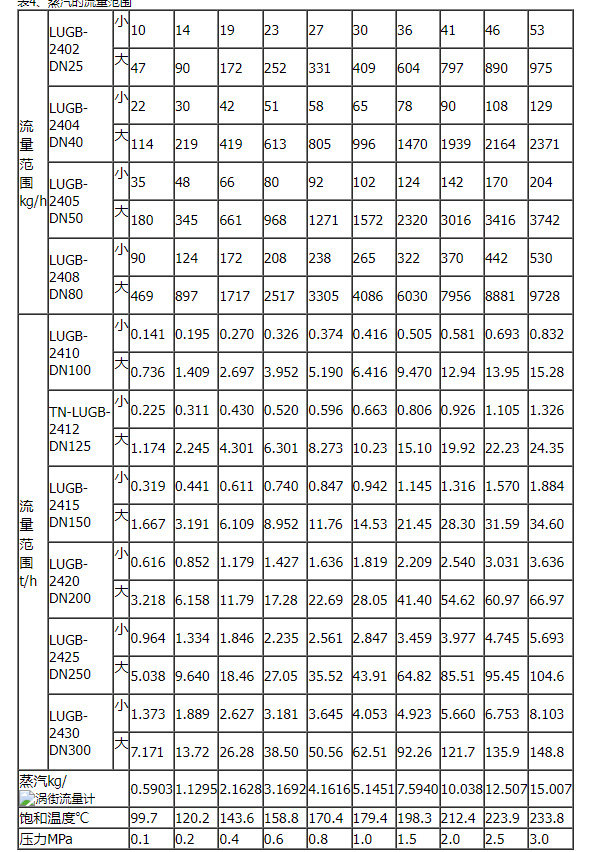 LUGB/E系列渦街流量儀表參比條件下渦街流量傳感器工況流量范圍表
